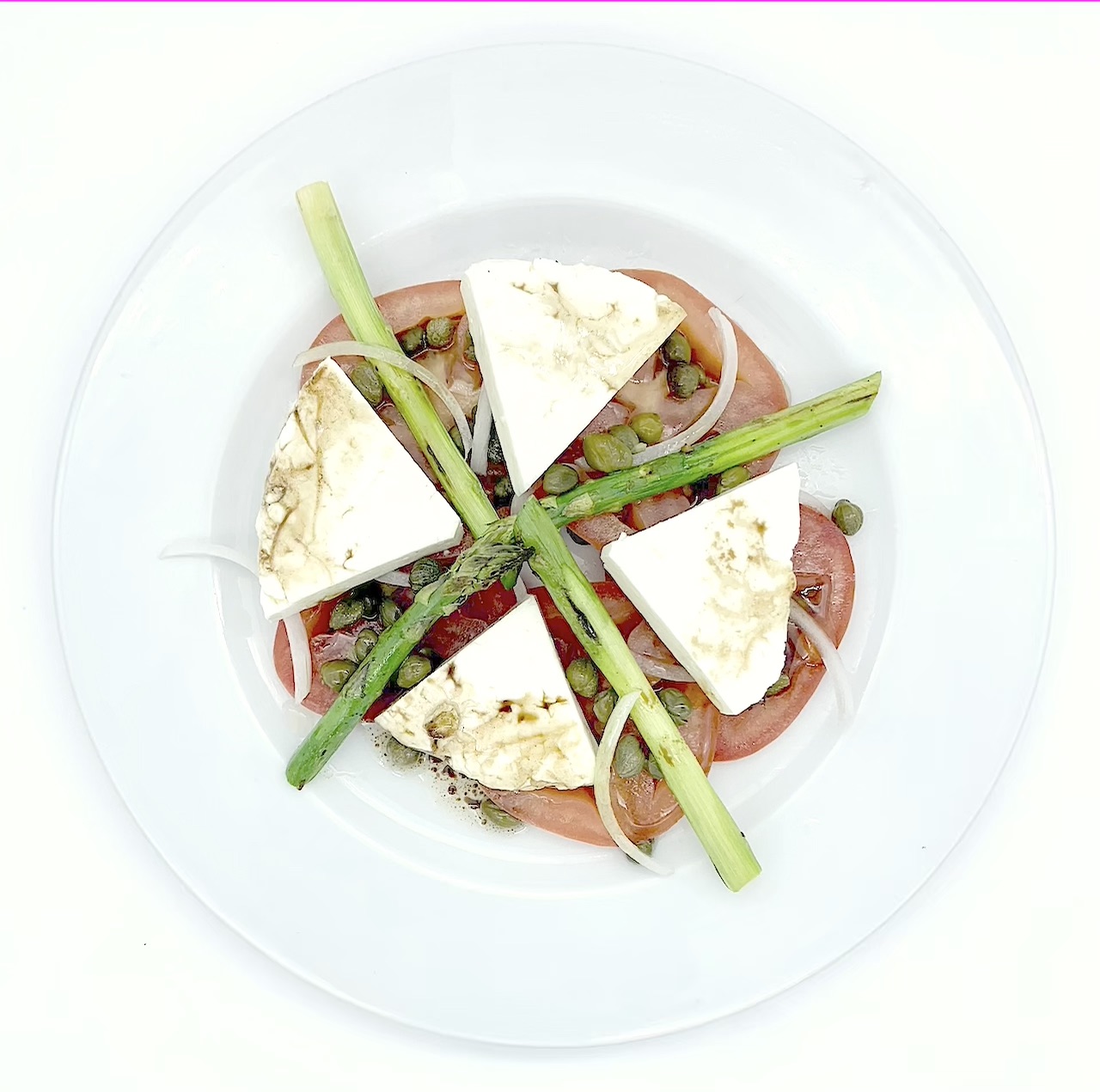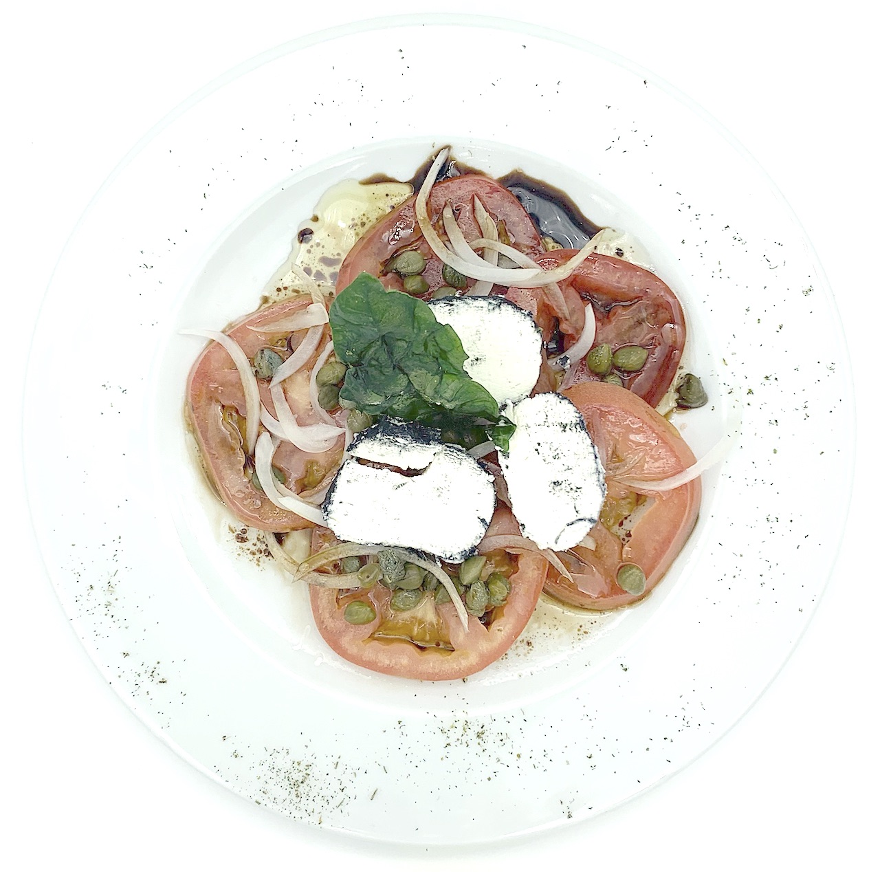 Jitomate bola, queso de cabra ceniza, cebolla, alcaparra, fritura de espinaca, vinagreta de balsamico