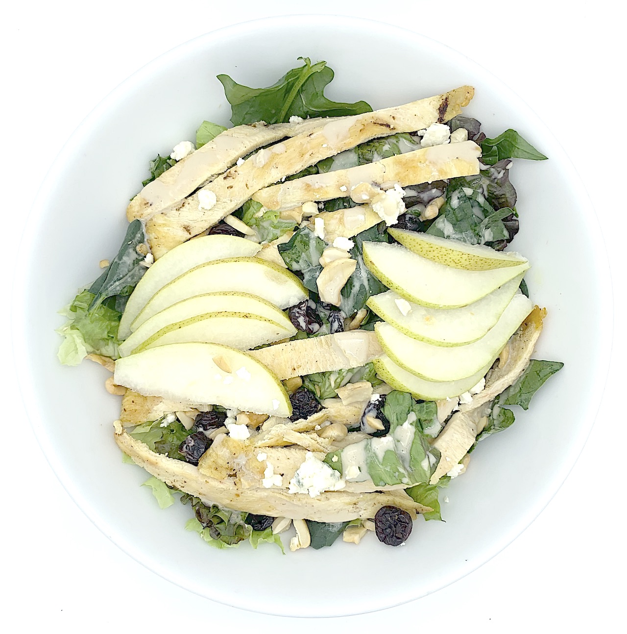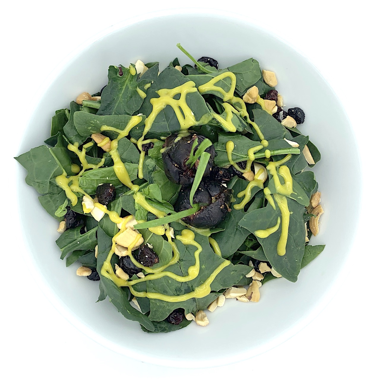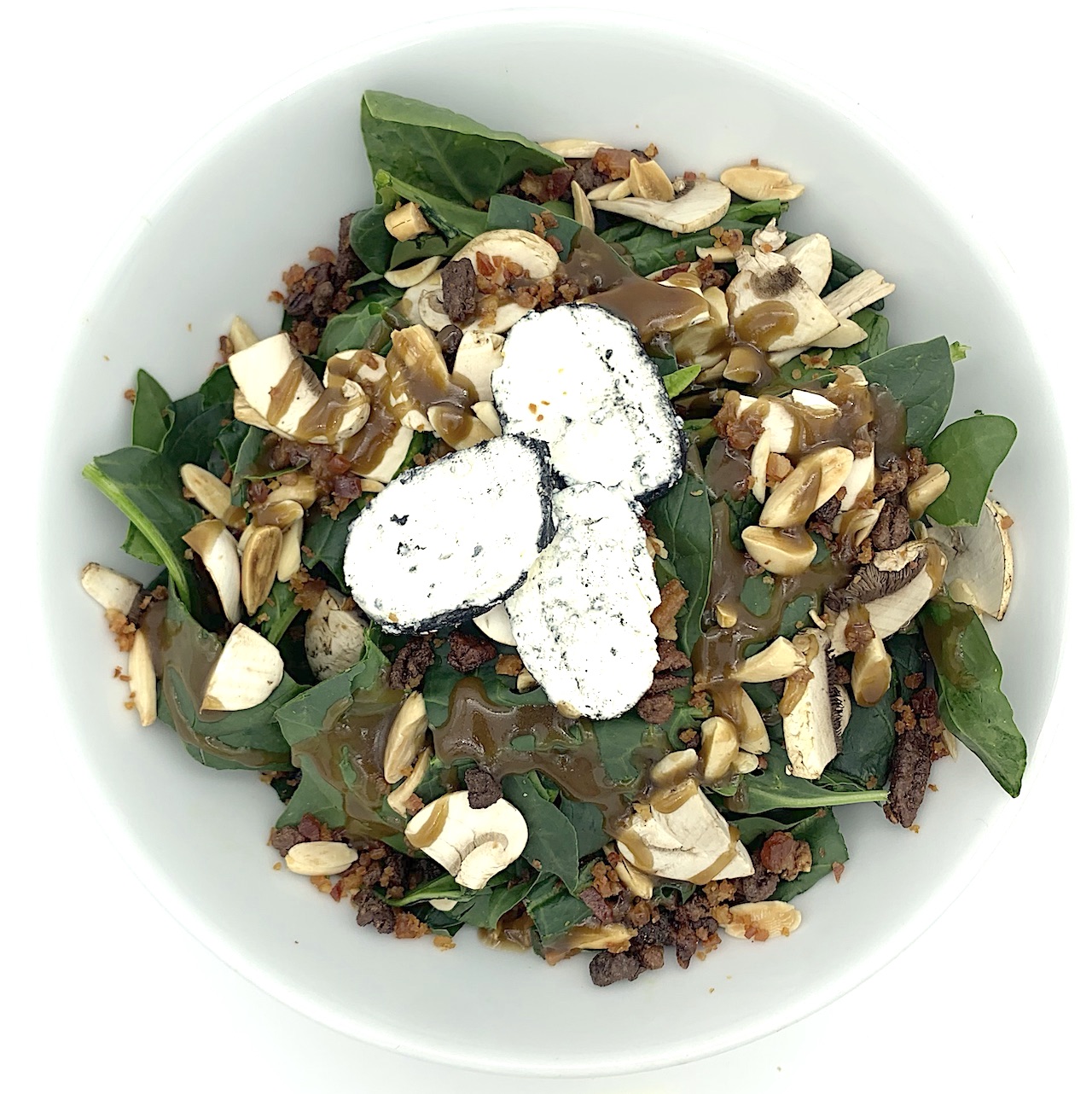 Espinaca, champiñon, durazno, tocino frito, nuez garapiñada, hojuelas de almendra, queso cabra ceniza y aderezo de miel