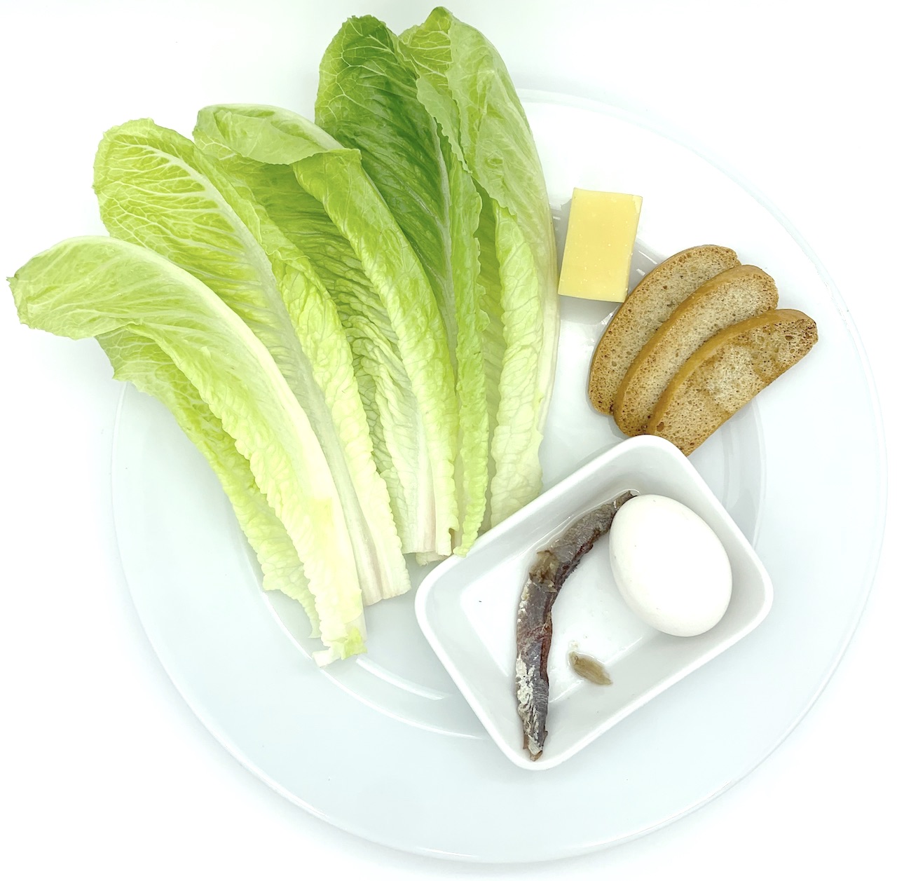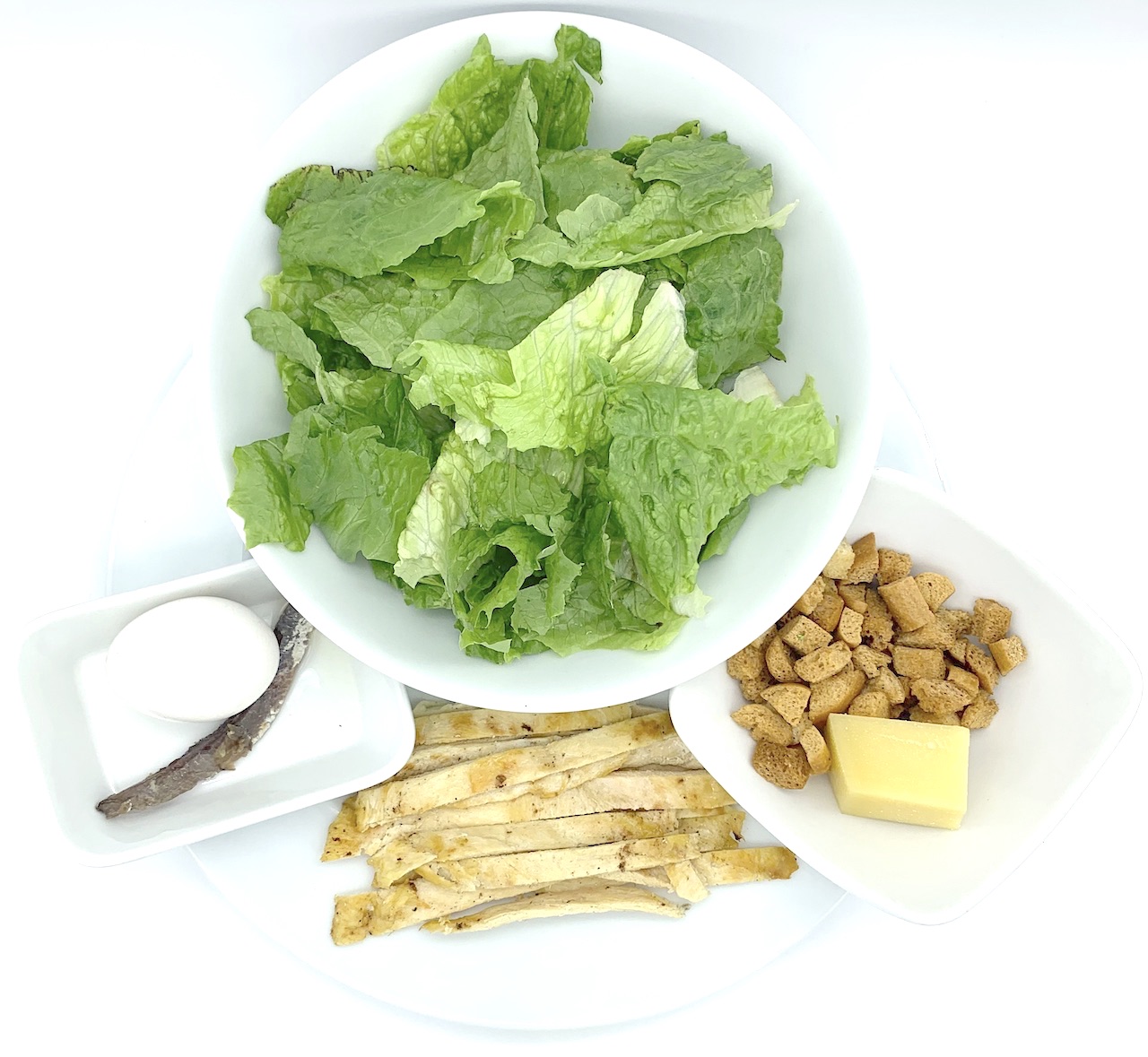 Lechuga larga, crotones, queso parmesano, aderezo de anchoa y pechuga de pollo