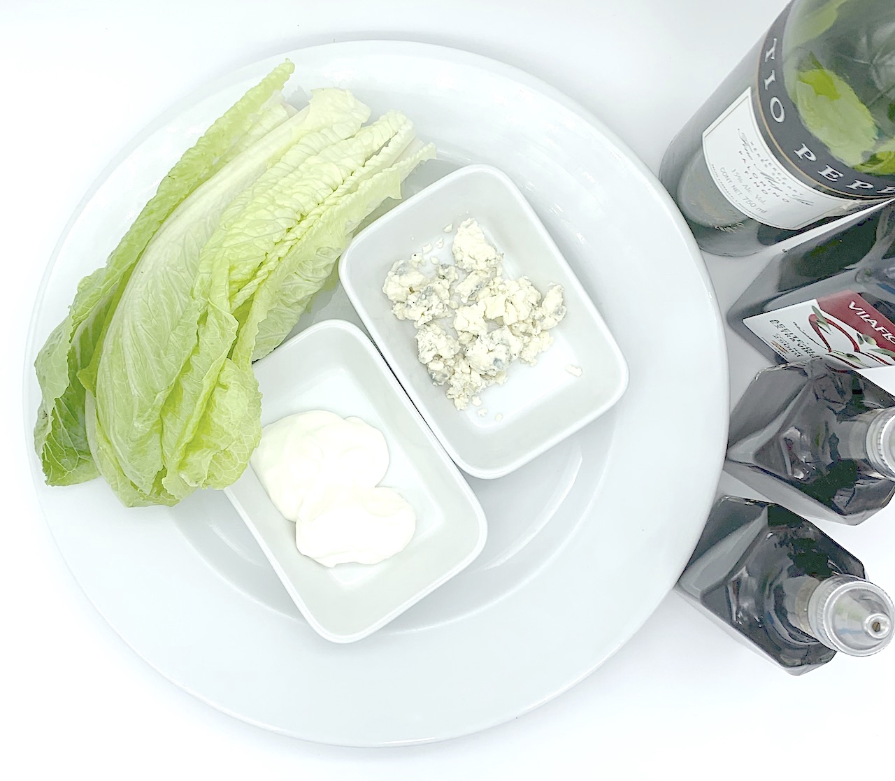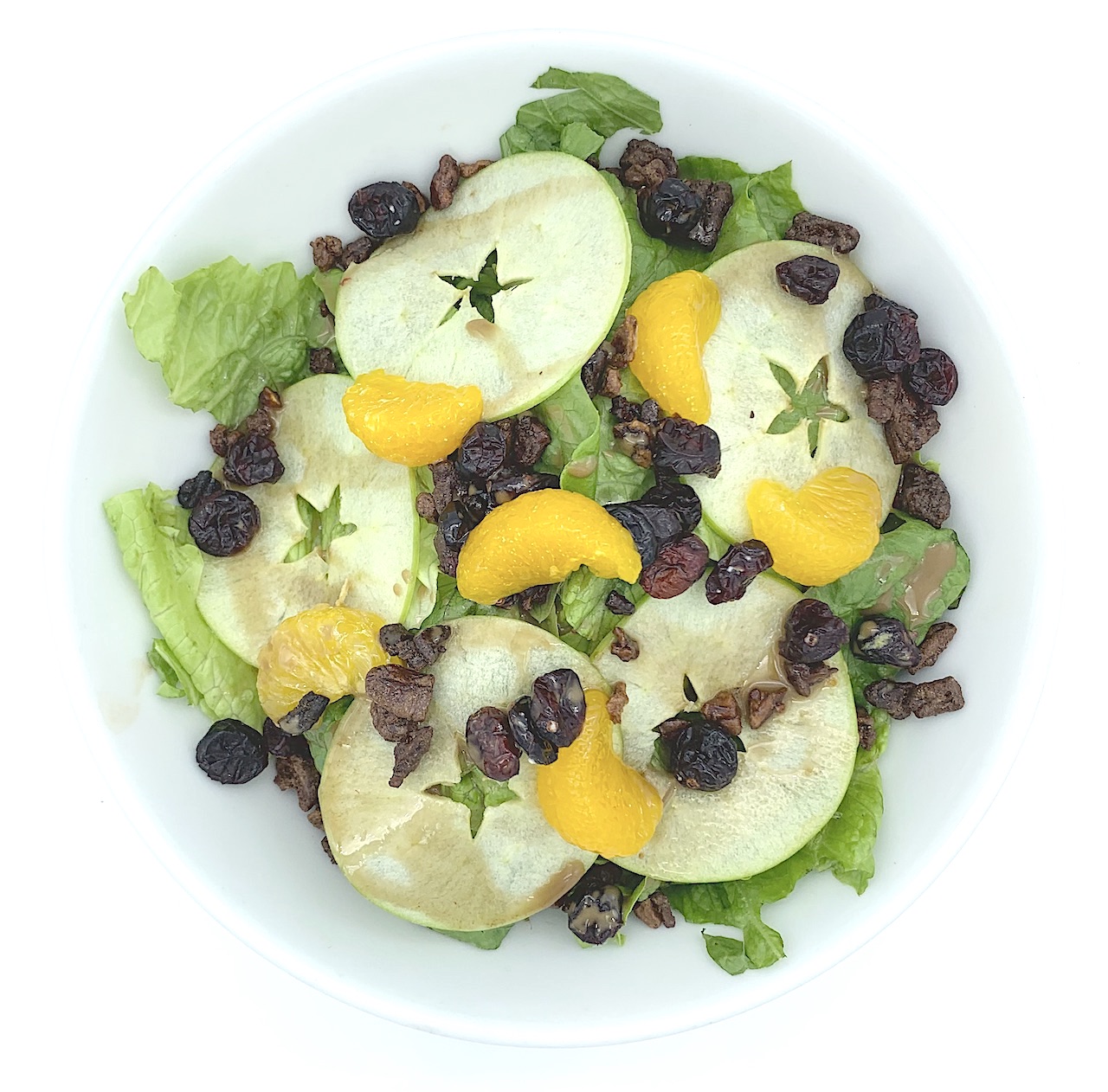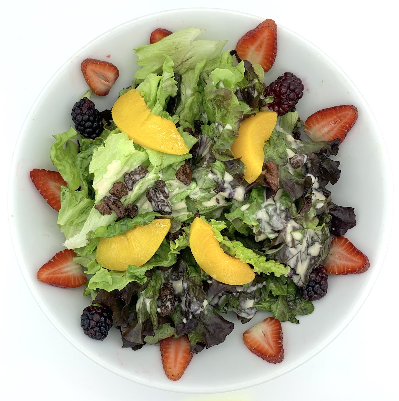 Lechuga sangria, fresa, durazno, nuez garapiñanda y aderezo azul
