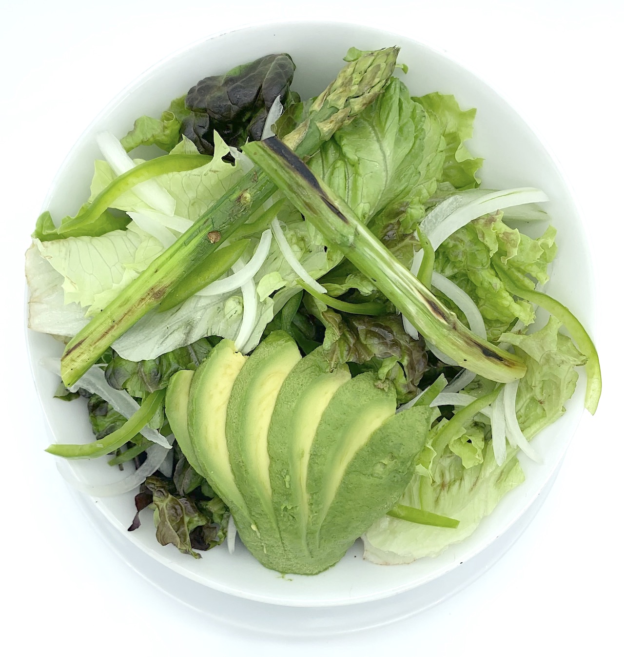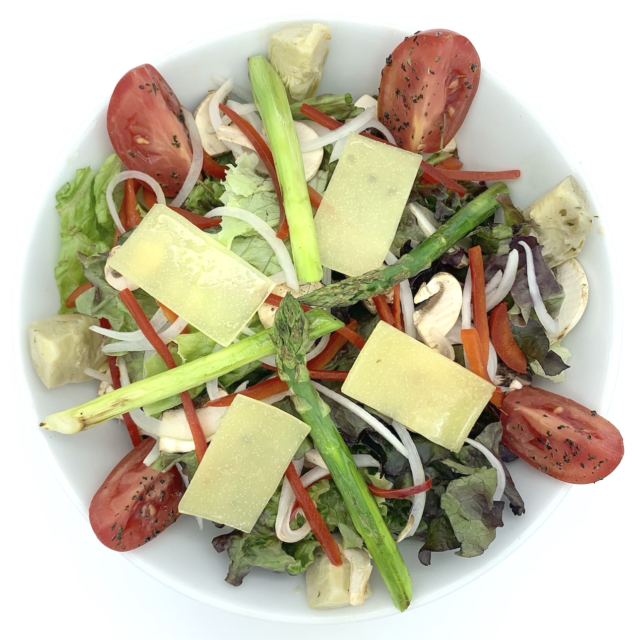 Lechuga sangria, alcachofa, champiñon,cebolla, esparrago, pimiento morron, jitomate, queso parmesano y vinagreta de balsamico