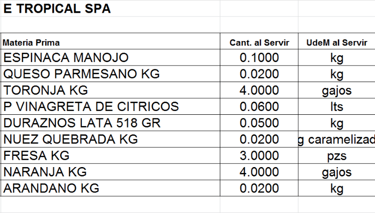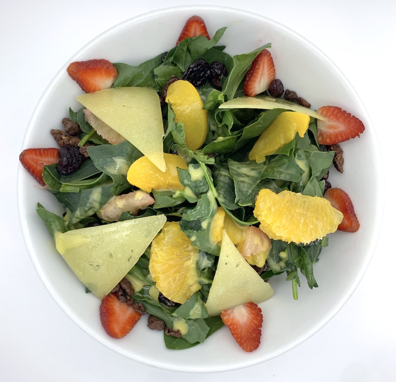 Espinaca, supremas de toronja y naranja, fresa, durazno, nuez garapiñada, arandano y vinagreta de citricos